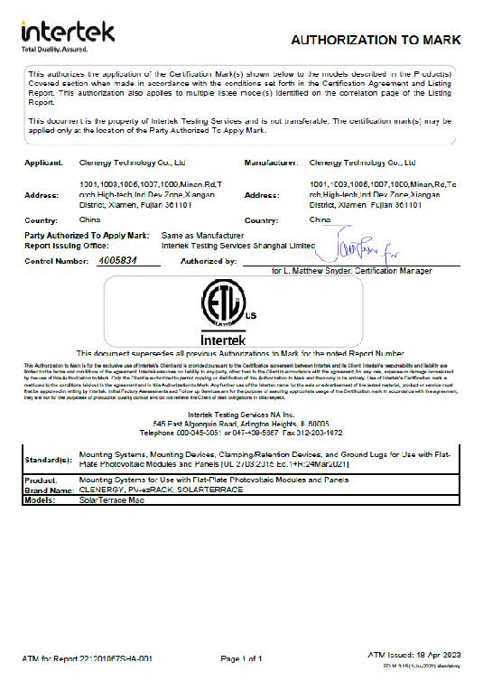 This authorises the application of the Certification Mark(s) to PV-ezRACK, SOLARTERRACE, Model SolarTerrace Mac, when made in accordance with the conditions set forth in the Certification Agreement and Listing Report.